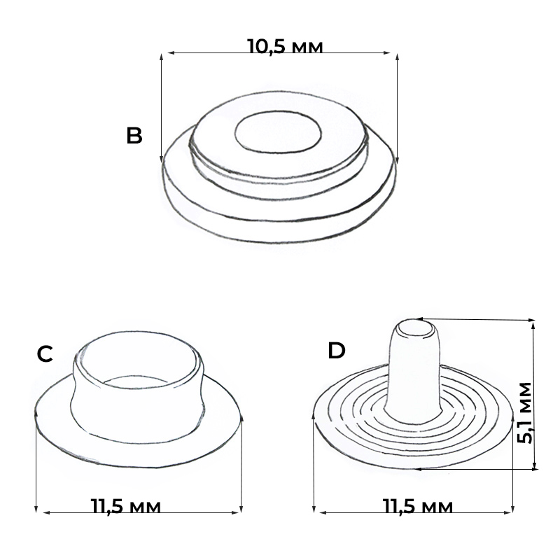 - Кнопки с различными размерами шляпок контакта # 405 имеют одинаковые размеры нижних деталей.